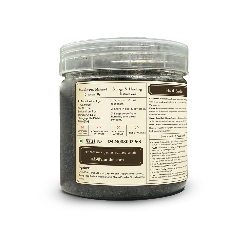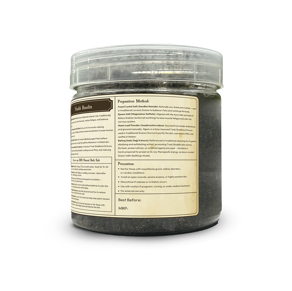 Experience the healing power of Ayurveda with our 100% natural Neem Bath Salt, crafted to detoxify and restore balance. This mineral-rich blend combines Sendha Namak and soothing Epsom Salt to relax muscles and calm Vata dosha. Baking soda softens water and soothes irritated skin, while Neem, an ancient Twak Shodhana (skin-purifying) herb, cleanses pores, cools excess Pitta, and helps reduce acne, itching, and unwanted odors.
